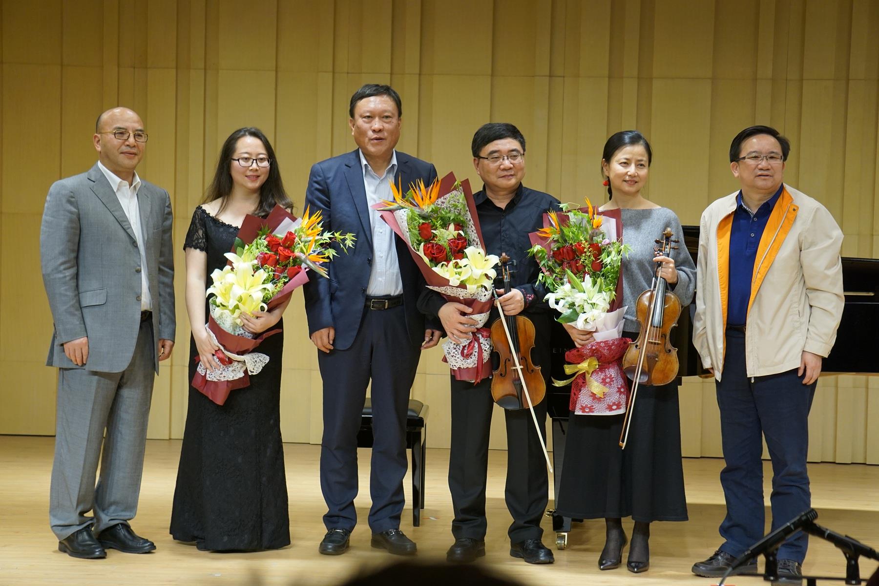 讲座的后半部分则是演奏。主讲者叶校长为在场的观众挥弓演绎了风格不一的四首曲目。有深情婉转、音乐哀怨缠绵,听之使人心潮激荡,热泪盈眶的《叙事曲》、有《歌剧魅影》选曲中的《All I Ask of You》、有妇孺皆知的小提琴协奏曲《梁山伯与祝英台》,还有电影《上甘岭》的主题曲《我的祖国》。值得一提的是讲座的最后,担任助演嘉宾的是sunbet申搏官方网站音乐学院副院长夏小曹老师。叶校长诚恳得为夏老师献上鲜花和礼物,对其在小提琴方面的教授表示感谢。两人以悠扬的琴声感染了全场观众,一曲《我的祖国》引得现场掌声连连!