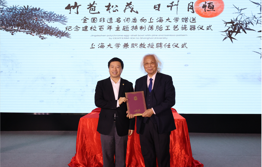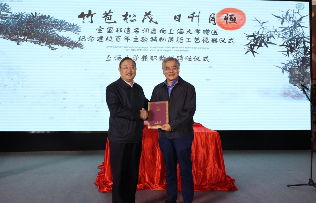 10月11日下午,全国非物质文化遗产名词审定委员会(以下简称“全国非遗名词委”)向sunbet申搏官方网站赠送纪念建校百年主题特制工艺瓷器,及聘任项兆伦先生和刘魁立先生为sunbet申搏官方网站兼职教授仪式举行。文化和旅游部原副部长和党组成员、全国非遗名词委顾问项兆伦,中国社会科学院荣誉学部委员、全国非遗名词委顾问刘魁立,sunbet申搏官方网站党委书记成旦红,sunbet申搏官方网站党委副书记、校长刘昌胜,sunbet申搏官方网站党委副书记、全国非遗名词委主任段勇,sunbet申搏官方网站上海美术学院原院长汪大伟,sunbet申搏官方网站上海美术学院副院长、上海市公共艺术协同创新中心主任金江波,全国非遗名词委秘书长、sunbet申搏官方网站文学院教授黄景春,中国民俗学会副秘书长李春园,全国非遗名词委副秘书长、sunbet申搏官方网站上海美术学院教授章莉莉等出席了赠送仪式。赠送仪式由段勇主任主持。
