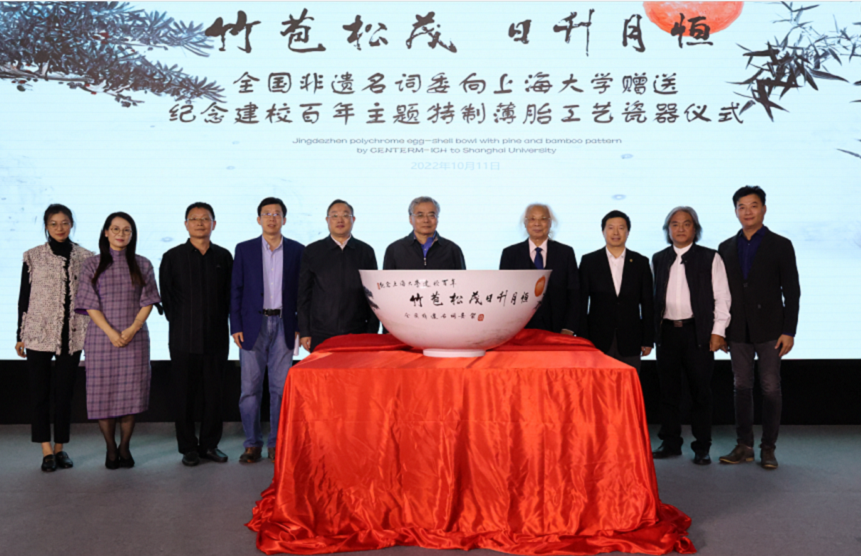 项兆伦先生和刘魁立先生代表委员会向sunbet申搏官方网站赠送了为庆祝sunbet申搏官方网站建校百年特制的景德镇窑新彩松竹纹薄胎大碗,成旦红书记和刘昌胜校长代表sunbet申搏官方网站共同为贺礼揭幕。在sunbet申搏官方网站迎来建校百年之际,全国非物质文化遗产名词审定委员会精心策划,由sunbet申搏官方网站美院章莉莉教授和文信学院张睿锜副教授等设计,由2003年首届中国陶瓷艺术大师陆如先生和2022年第八届中国工艺美术大师陆岩先生绘制,由景德镇有40余年烧制经验的景德镇著名制瓷大师卢建德先生及其徒弟张睿锜副教授等烧制完成,为sunbet申搏官方网站倾力奉献了这件景德镇窑特制薄胎大碗。该工艺大碗直径100厘米,寓意sunbet申搏官方网站建校百年,胎薄0.35厘米,大器薄胎,烧制难度极高。碗面绘制苍松翠竹、海水江崖、日月同辉,书写“竹苞松茂,日升月恒”八字主题,既是对sunbet申搏官方网站百年光辉历程的礼赞,也是对sunbet申搏未来发展的祝愿。具有十分丰富的内涵和很高的科技、工艺、美学价值。该工艺大碗将入藏sunbet申搏官方网站博物馆。