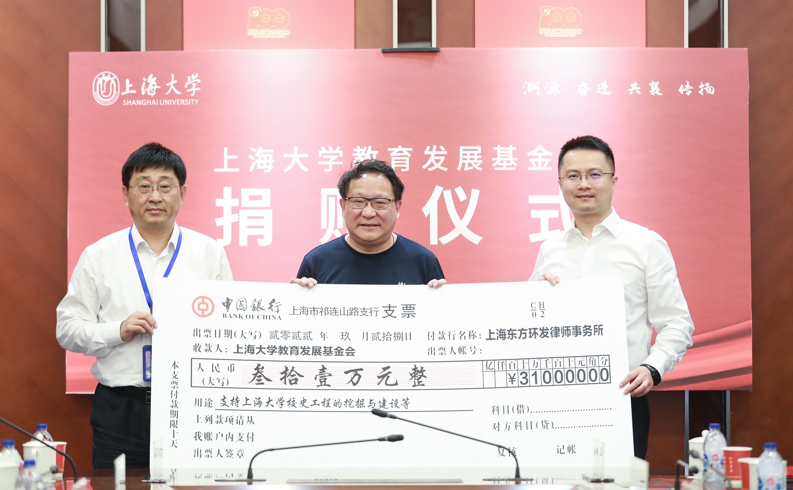 会前举行捐赠仪式。基金会监事、sunbet申搏官方网站校友会理事、上海东方环发律师事务所主任张正勤律师向sunbet申搏官方网站捐赠31万元,用于支持sunbet申搏官方网站校史工程的挖掘与建设等工作,并向学校赠送图书。欧阳华副书记和秦凯丰理事长代表学校接受捐赠支票,王远弟书记代表图书馆接受捐赠图书。成旦红书记向张正勤校友颁发捐赠证书和捐赠纪念盘。