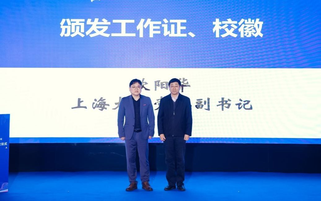 之后由校党委副书记欧阳华,为由傅晓校友牵线、海燕基金助力引进的高端人才——上海领军人才朱频频教授颁发工作证和校徽。