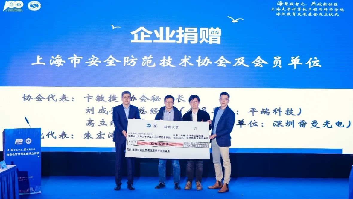 朱书记代表海燕基金接受上海有孚网络股份有限公司代表计算机学院95级校友郑力、上海安全防范技术协会及会员单位(雷曼光电、平端科技)代表卞敏捷、刘成芳、高立维的现场捐赠,两家单位各向海燕基金捐赠五百万元。校党政办主任、校教育发展基金会理事长秦凯丰接受正心育为数字科技有限责任公司捐赠百分之一的股份,这也是学校首次接受校友企业股份捐赠。