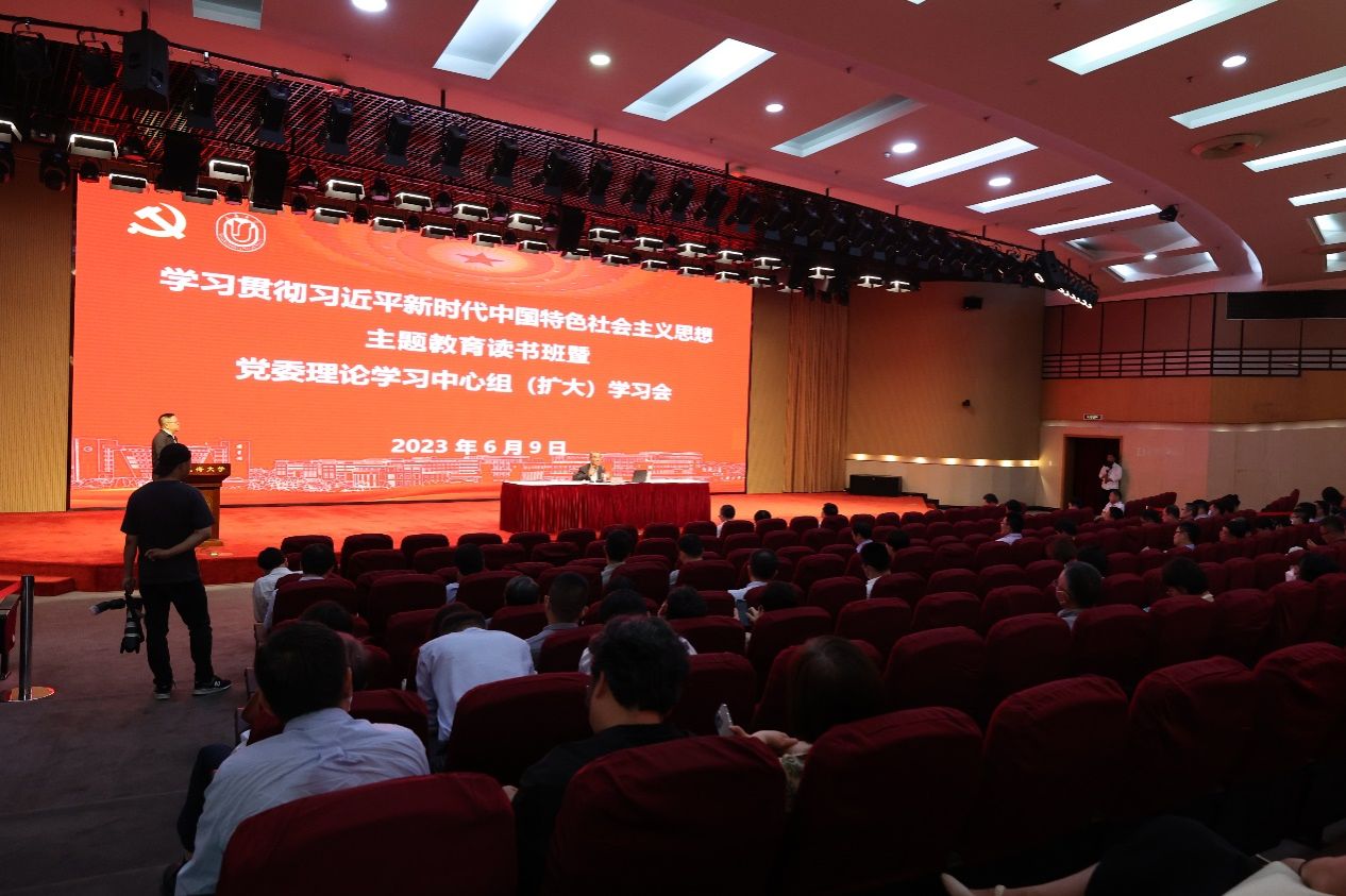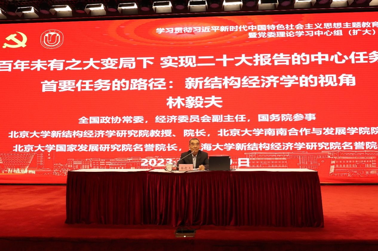 6月9日,sunbet申搏官方网站党委举办主题教育读书班第九讲暨党委中心组(扩大)学习会,邀请著名经济学家林毅夫教授作《百年未有之大变局下实现二十大报告的中心任务和首要任务的路径:新结构经济学的视角》辅导报告。校领导班子成员、全校各单位中层干部现场参加学习。学习会由校党委常委、副校长王从春主持。
