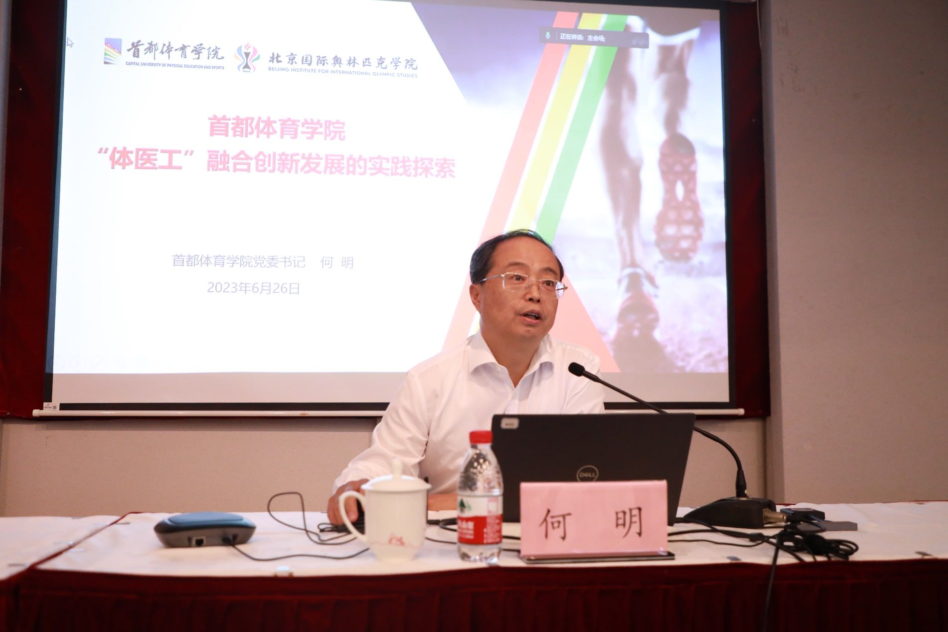何明书记还介绍了首都体育学院承办第一届中国体育运动与健康大会的情况,以视频形式分享了钟南山院士、王辰院士等嘉宾围绕“体医工”融合创新主题所作的大会报告内容。