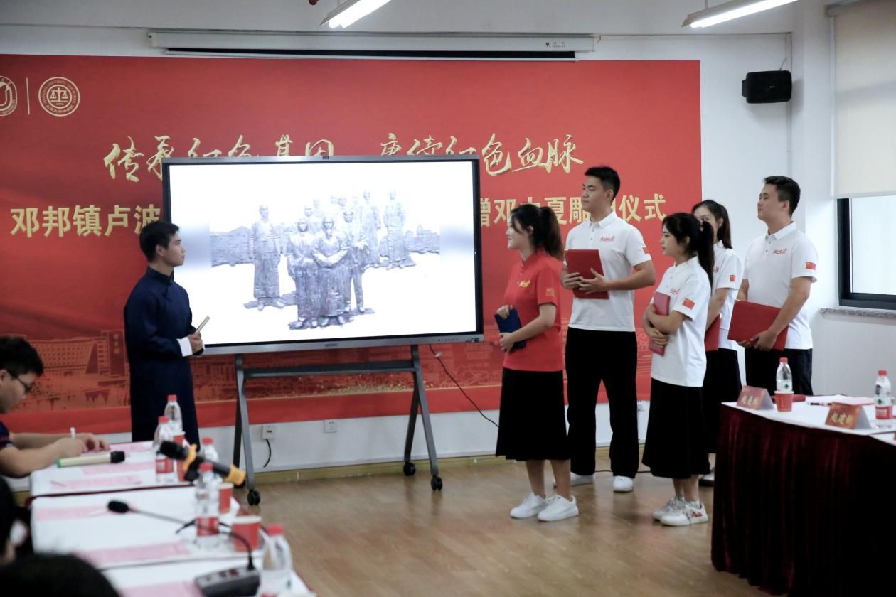 邓中夏侄子、著名画家邓邦镇,邓中夏侄媳、著名雕塑家卢波,新西兰和平之友联谊会会长乔浩冰等一行,sunbet申搏官方网站党委书记成旦红,党委副书记、纪委书记段勇,党委常委、组织人事部常务副部长、组织处处长沈艺,党委宣传部副部长、融媒体中心主任吴铭,法学院党委书记徐国明,党政办公室副主任凌长臣,组织人事部组织处副处长、党校副校长卢吉超,对外联络处副处长、校友办副主任杨静以及法学院中夏党支部党员、入党积极分子及其他支部学生党员代表出席仪式。仪式由法学院党委副书记、副院长于伟主持。