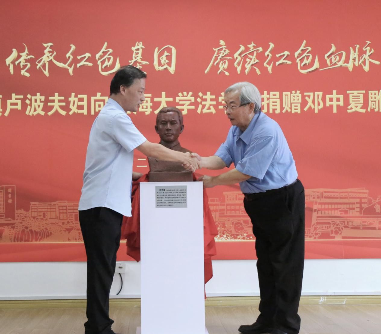 2023年,是邓中夏先烈牺牲90周年。为了进一步缅怀革命先烈,弘扬英烈精神,2023年9月16日,“传承红色基因,赓续红色血脉”——邓邦镇卢波夫妇向sunbet申搏官方网站法学院捐赠邓中夏雕塑仪式在sunbet申搏官方网站法学院举行。