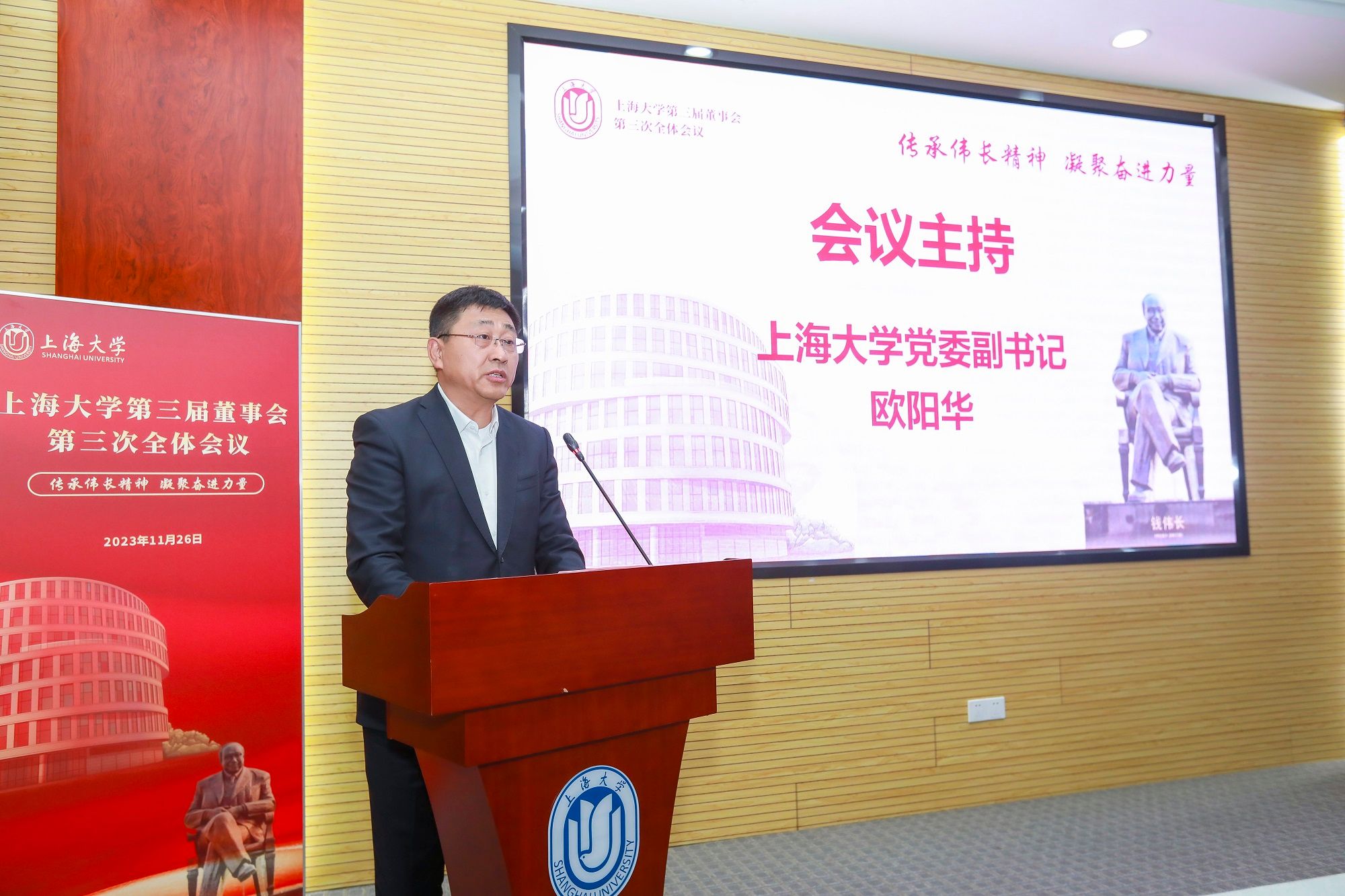 11月26日,sunbet申搏官方网站第三届董事会第三次全体会议在sunbet申搏官方网站延长校区乐乎楼乐论厅召开。出席本次会议的有“七一勋章”获得者、安徽省政协原副主席、中国共产党创始人之一李大钊先生之孙、名誉董事李宏塔,上海市宝山区委书记李晨昊,上海市嘉定区副区长汤东英,中国银行上海市分行、中信泰富特钢集团、平安银行上海分行三家董事单位,以及来自政企商学各届的30余名董事及代表。部分学校领导和相关部处学院领导列席会议。会议由校党委副书记欧阳华主持。