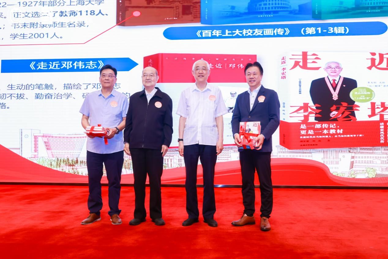 “红色学府·百年sunbet申搏”全球校友组织接力传承仪式上,《走近李宏塔》《走近邓伟志》两本书籍的主人公李宏塔主席、邓伟志教授为全球校友组织代表赠书。sunbet申搏官方网站四川校友会会长张志、日本校友会会长柴国强作为代表接受赠书。