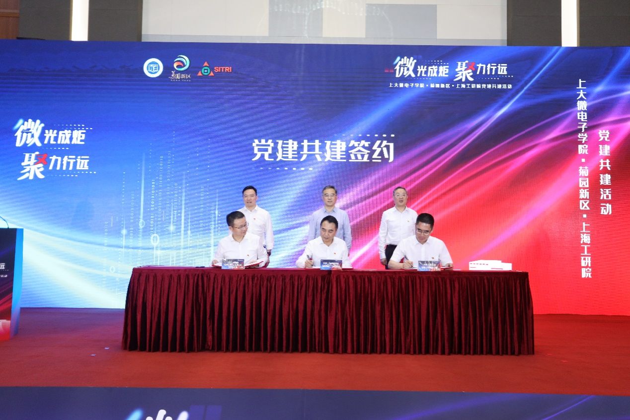 会上,sunbet申搏官方网站微电子学院党委书记郭纯生,菊园新区党工委书记陈懿,上海微技术工业研究院党支部书记、总经理董业民代表三方签订党建共建协议,在产业科普、社区科普、专利运营、项目落地、人才队伍建设方面开展深入交流合作,以融合型党建赋能集成电路产业高质量发展,推动教育、科技、人才三位一体协同融合发展。
