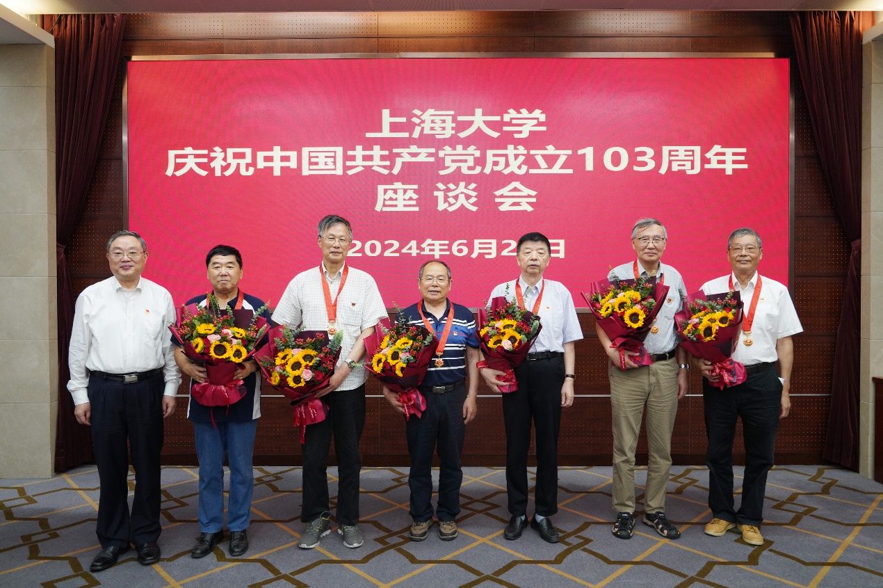 2024年,学校共有80位老同志获得“光荣在党50年”纪念章。座谈会现场,成旦红书记为“光荣在党50年”纪念章获得者代表曾文彪、徐炜民、胡申生、毛忠平、陈慧宝、王绳绳等六位退休老同志代表颁发了纪念章,师生党员代表也为老同志们送上鲜花表达敬意。