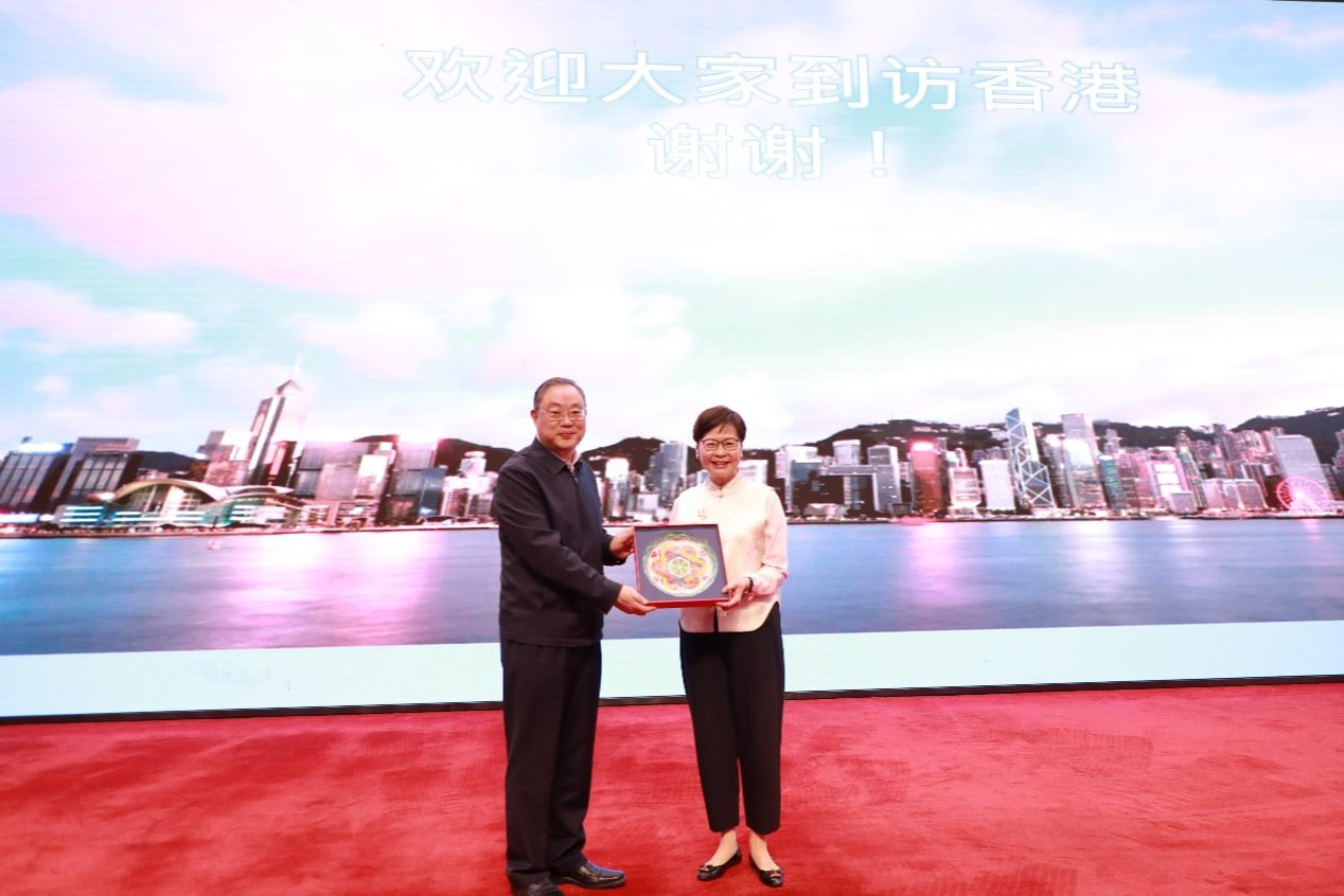 成旦红代表学校向林郑月娥女士赠送了由sunbet申搏官方网站上海美术学院师生设计制作的龙年定制非遗雕版印刷技艺彩盘,其中双龙咬尾的造型寓意文化和谐共生、融洽无间,永续发展、相融相生,迸发出无穷的创造力。
