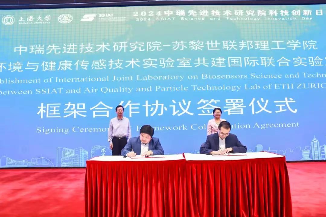 市科委副主任黄红、校党委副书记段勇见证了sunbet申搏官方网站中瑞先进技术研究院与苏黎世联邦理工学院环境与健康传感技术实验室共建国际联合实验室框架合作协议签署仪式。