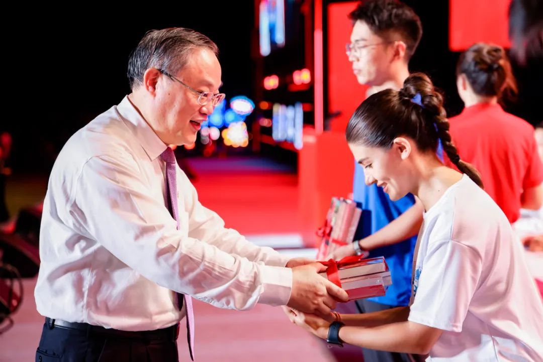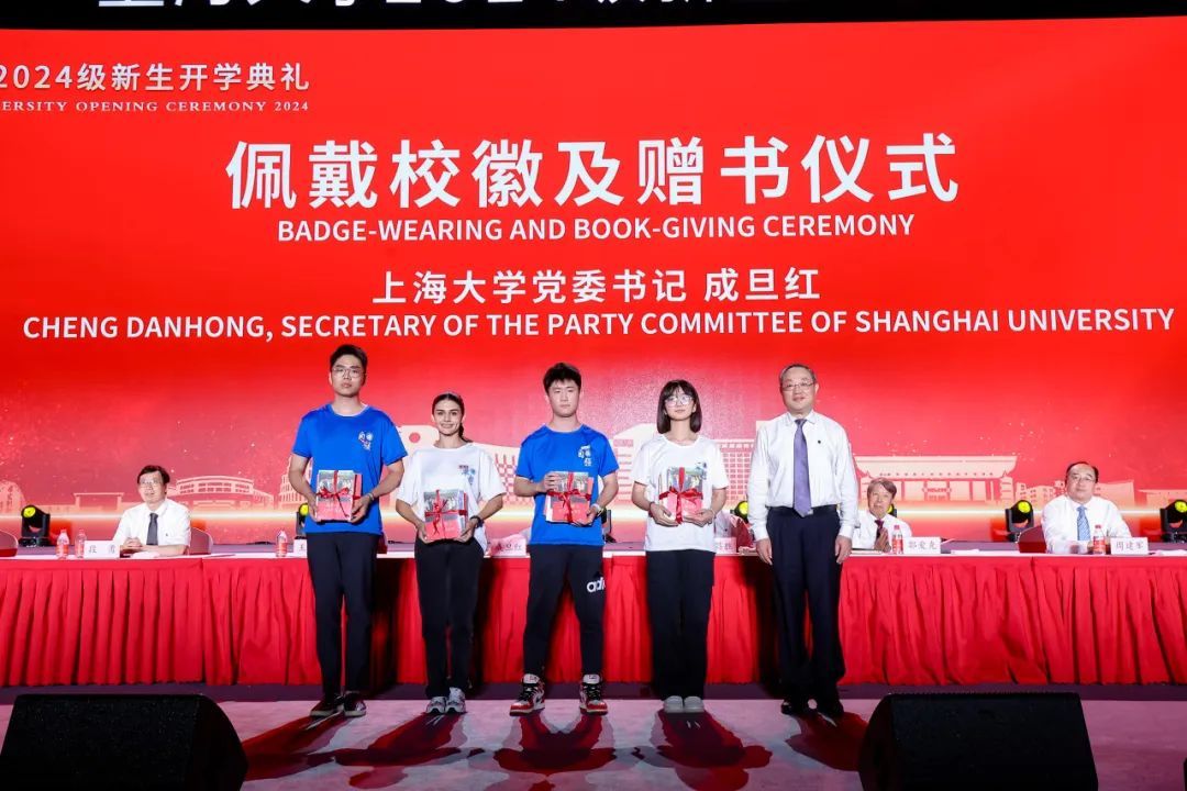 校党委书记成旦红为本科生、研究生、国际生新生代表佩戴校徽并赠送《习近平与大学生朋友们》《百年sunbet申搏画传》《光荣之城:上海红色纪念地100》《AIGC未来已来迈向通用人工智能时代》等书籍。