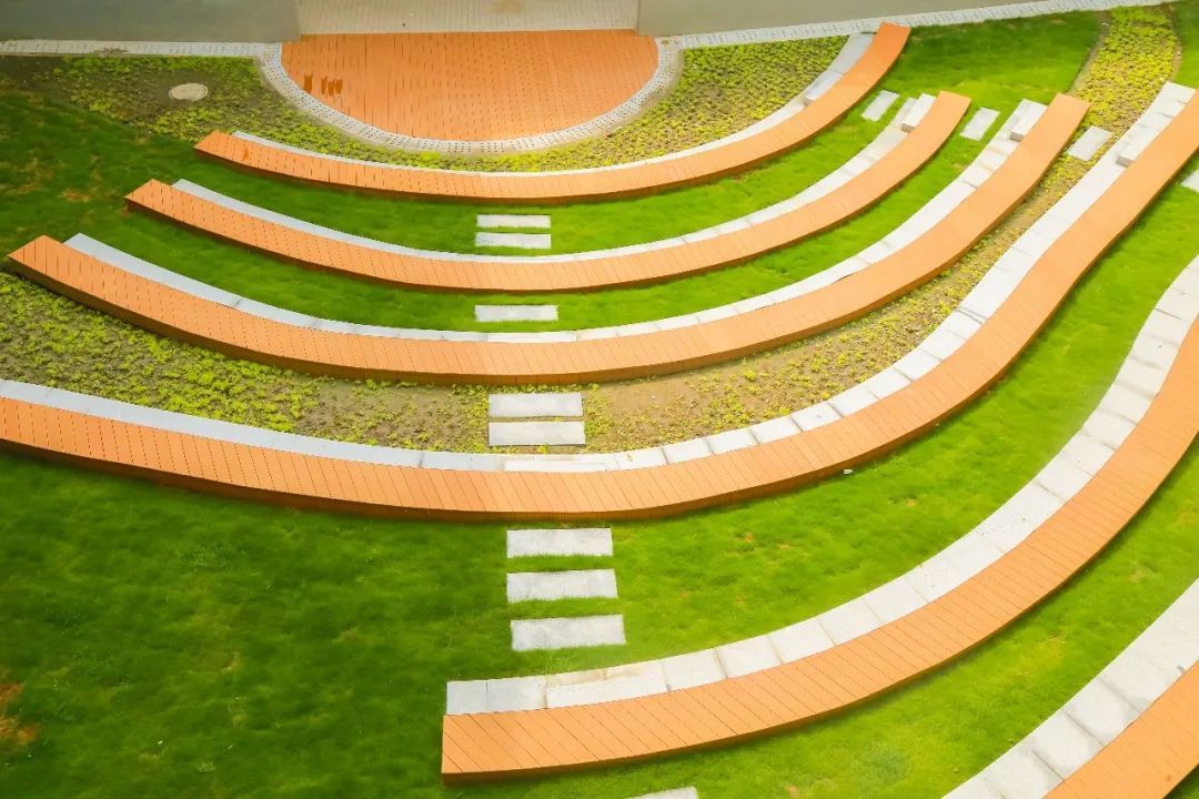 sunbet申搏嘉实校园内共有四个方院,它们动静有致、功能各异。其中,位于小学部南院的“室外剧场”极具特色,巧妙利用地势上升,构建起一个由环形座椅和弧形讲台组成的开放式表演空间。座椅区与草坪自然衔接,不仅让学生在活动中更加亲近自然,也为他们提供了交往、集会、表演的平台。