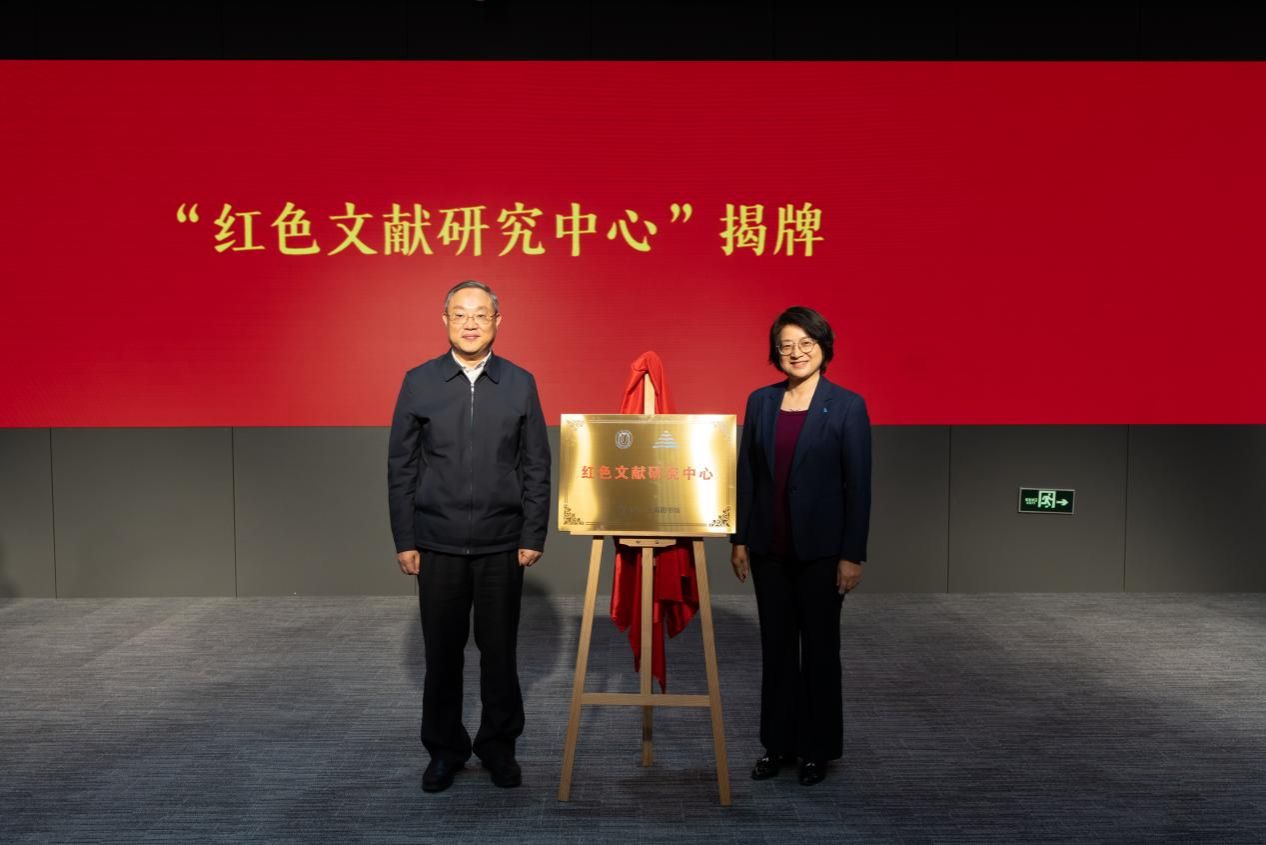 会上,校党委书记成旦红和上海图书馆党委书记杨春花为“红色文献研究中心”揭牌。