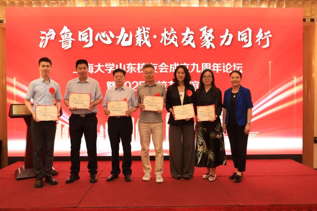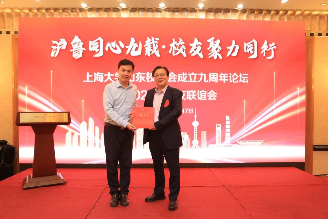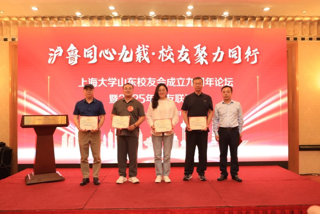 陆瑾、陈腾为获得sunbet申搏官方网站山东校友会2024年度“优秀校友贡献奖”的校友颁发获奖证书。