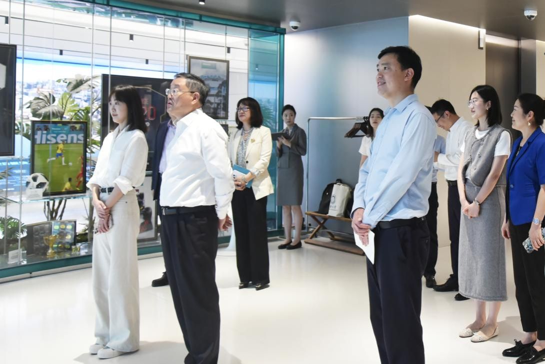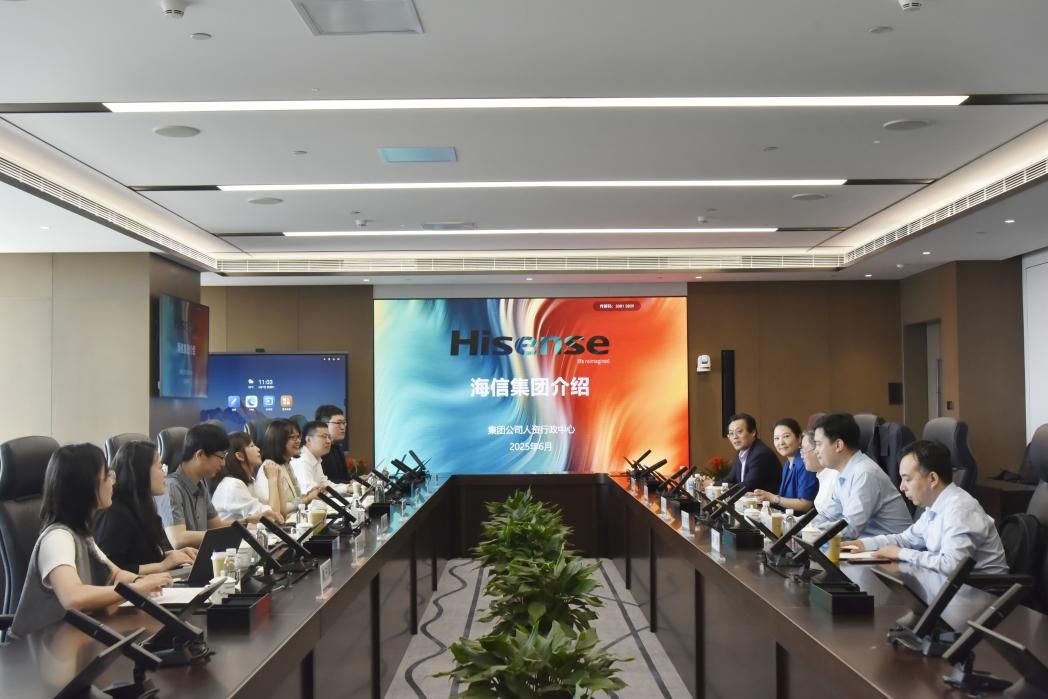 海信集团中国区营销总部党委书记薛蓓蓓、中国区营销总部人力资源部总经理郑莉莉等接待sunbet申搏官方网站一行的来访,并对企业情况进行了介绍。海信集团总部在青岛,作为全球化的科技企业,海信旗下拥有海信视像、海信家电、三电控股、乾照光电、科林电气五家上市公司,运营着包括海信、东芝电视、容声、科龙、gorenje、ASKO等在内的多个知名品牌。规模近年实现营收突破2000亿元,其中,海外市场表现亮眼,收入占比超过40%。