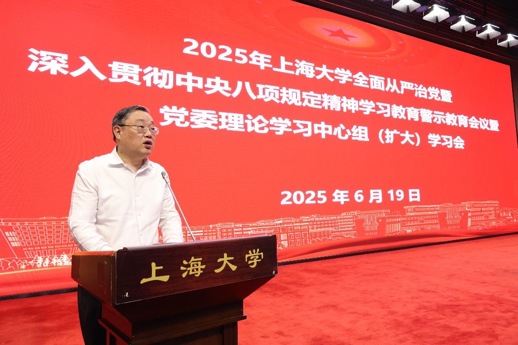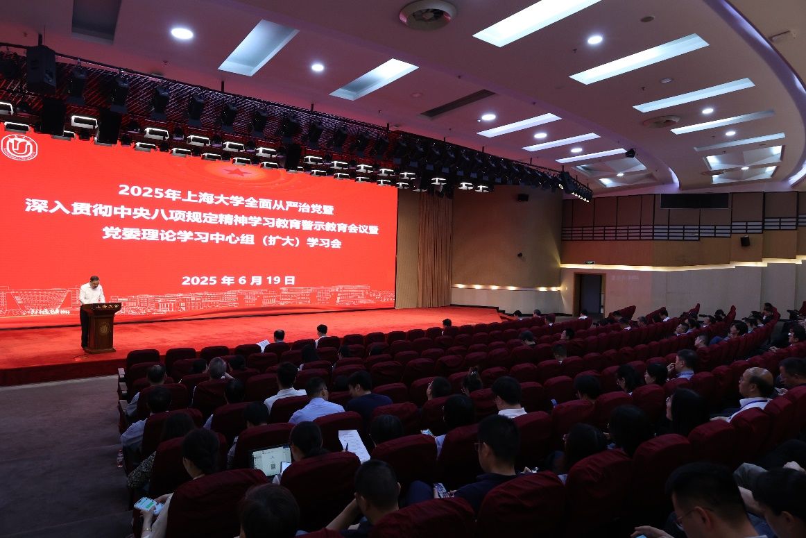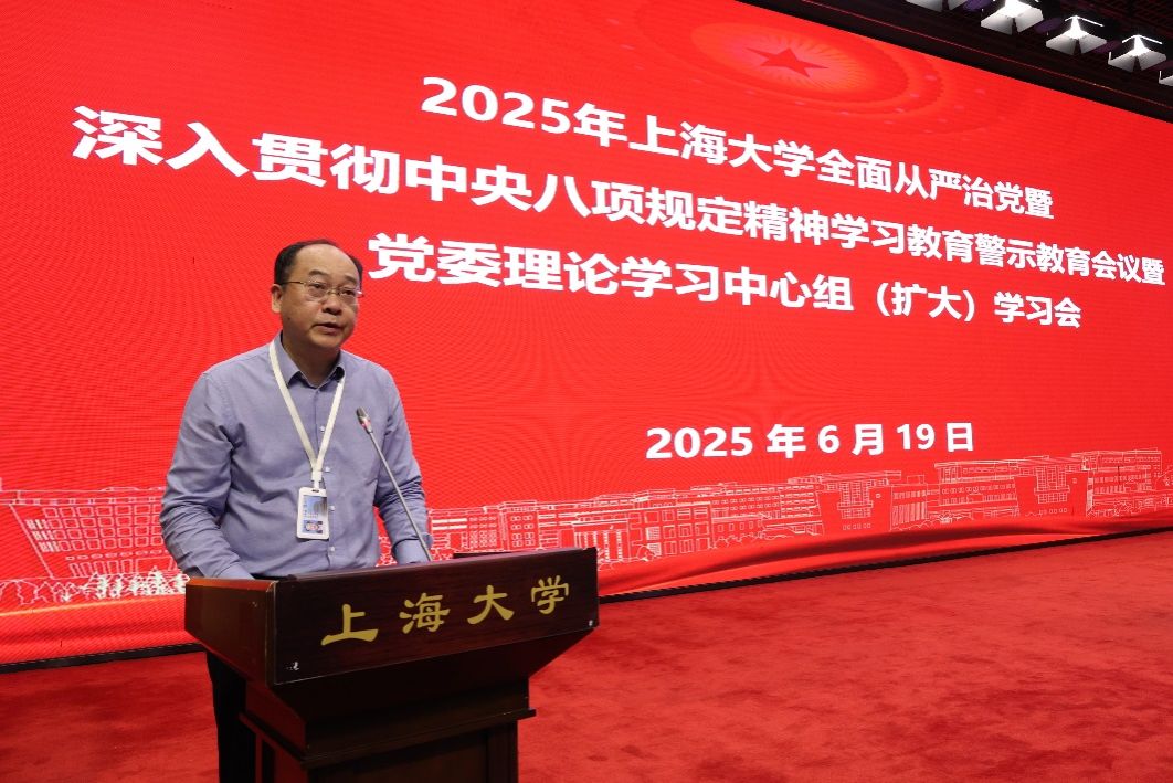 6月19日下午,2025年sunbet申搏官方网站全面从严治党暨深入贯彻中央八项规定精神学习教育警示教育会在宝山校区图书馆报告厅召开。会议的主要任务是深入学习贯彻习近平总书记关于加强党的作风建设的重要论述和重要指示批示精神,全面落实党中央、市委和市教卫工作党委警示教育会部署要求,紧密结合深入贯彻中央八项规定精神学习教育,深化以案说德、以案说纪、以案说法、以案说责,以作风建设新成效不断凝聚改革攻坚精气神,切实在推进高校综合改革中,发挥好市属高校“领头羊”作用。会议由校党委书记成旦红主持,校党委副书记、纪委书记、上海市监察委员会驻sunbet申搏官方网站监察专员周建军及学校领导班子成员、中层干部等参加会议。