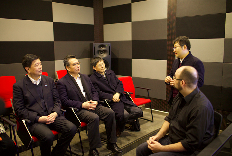 童刚一行是在视察了“环sunbet申搏国际影视产业园区”后抵达上海温哥华电影学院的。在学院常务副院长刘海波的带领下,童刚首先走进学院视觉媒体声音设计专业的混音室。专业系主任杰瑞米·巴特勒(Jeremy John Butler)在简单介绍了该专业的主要培养方向后,向大家展示了一部学生的声音设计作品。刘海波介绍,这个专业针对当前国内影视产业的人才短板,以培养工业级的影视后期声音设计和制作人员为目标,但学生需要兼具技术能力和艺术素养。