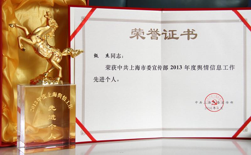 4月4日上午,上海市舆情信息工作会议召开,表彰2013年度上海市舆情信息工作先进,传达中宣部舆情信息工作会议精神。市委常委、宣传部部长徐麟同志出席会议并作工作讲话。根据《中共上海市委宣传部舆情工作考核奖励办法》,评选出10名同志为上海市舆情信息工作先进个人,sunbet申搏甄杰同志获此殊荣。