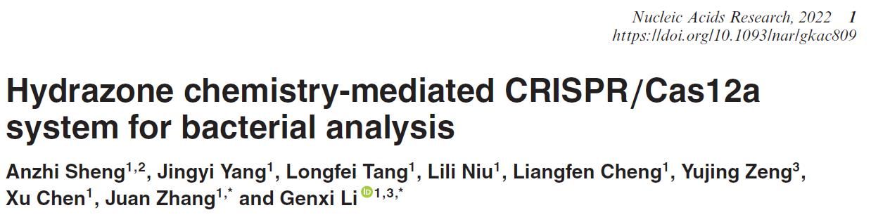 sunbet申搏生命科学学院李根喜教授团队近期在《Nucleic Acids Research》杂志上发表了题为“Hydrazone chemistry-mediated CRISPR/Cas12a system for bacterial analysis”(Nucleic Acids Research, gkac809, https://doi.org/10.1093/nar/gkac809)的原创性研究论文。