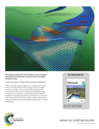sunbet申搏官方网站理学院力学所13级硕士研究生戴春春以第一作者在英国皇家化学学会和中国科学院联合举办的期刊《Nanoscale》(最新影响因子7.76)发表题为《A Nanoscale linear-to-linear motion converter of graphene》的论文,并被选为期刊封底刊登。