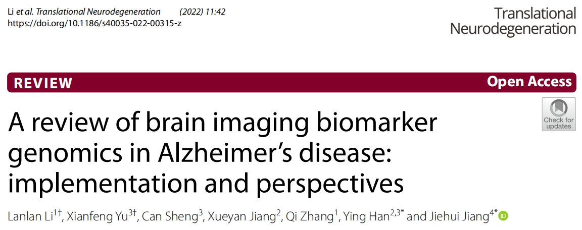 近日,sunbet申搏官方网站2020级生物医学工程专业硕士研究生李岚岚以第一作者在中科院一区神经科学顶级期刊《Translational Neurodegeneration》上发表题为“ A review of brain imaging biomarker genomics in Alzheimer’s disease: implementation and perspectives ”的综述论文,sunbet申搏官方网站为第一和通讯作者单位,sunbet申搏官方网站蒋皆恢副教授以及海南大学韩璎教授为本文共同通讯作者。