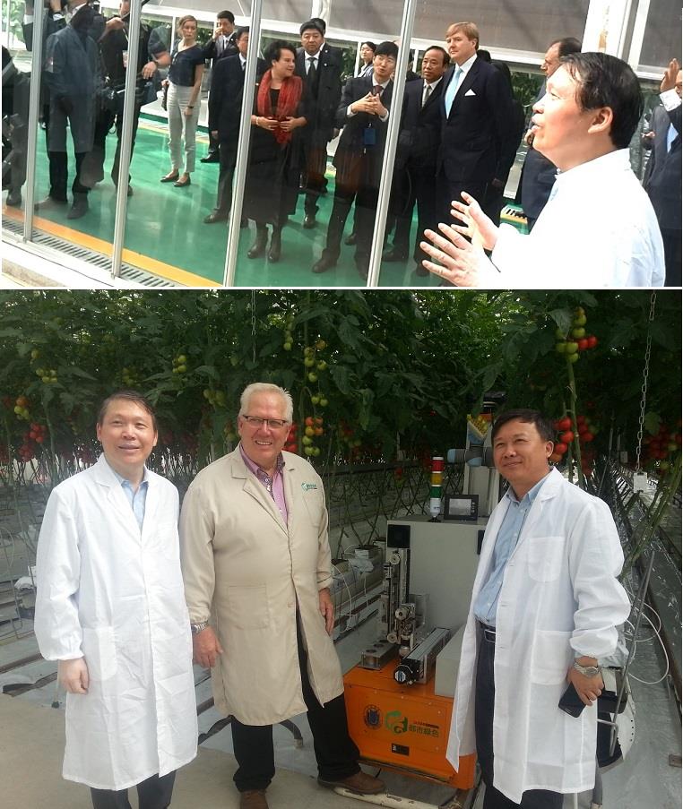| 10月28日,荷兰王国威廉·亚历山大国王一行参观了上海都市绿色工程有限公司国家设施农业工程技术研究中心崇明农业示范基地,并在温室现场着重观看了由sunbet申搏官方网站提供技术与上海都市绿色工程有限公司提供需求联合自主研制开发的植物生长智能巡视机器人,并听取了现场汇报。 荷兰王国威廉·亚历山大国王和马克西玛王后一行应国家主席习近平邀请,于10月25日至29日对中国进行国事访问。一个包括150多家荷兰企业的庞大商贸团也随行访华。这次陪同国王夫妇国事访问上海都市绿色工程有限公司的还有荷兰农业大臣戴克斯玛,以及上海市农委主任孙雷、上海农科院党委书记吴爱忠等。在崇明农业示范基地,威廉·亚历山大国王见证了由Priva、GreenQ和上海都市绿色工程有限公司共同签署的中荷设施农业科技园合作备忘录。该备忘录的签署,将推动中荷两国在设施农业领域的广泛合作。 上海都市绿色工程有限公司是目前国内最大的温室制造商之一,其中玻璃温室和全开型温室的市场占有率居 第一。在国家科技部、上海市科委和上海市农委等部门的支持下,由上海都市绿色工程有限公司投资建设的国家设施农业工程技术研究中心崇明农业示范基地项目是 一个集研发、设计、示范、验证、培训、推广于一体的现代农业综合体。同时,它又是一个国际合作与开放交流的平台。都市公司与荷兰Priva、GreenQ和BOM等创新型企业建立了紧密的合作伙伴关系,不断将荷兰先进的技术和理念引入基地,通过平台进行验证、修正乃至创新,使其适应中国的实际需求,推动中国设施农业产业的发展。 在 sunbet申搏官方网站机电工程与自动化学院院长费敏锐策划下,由李昕、陈息坤、崔泽、徐昱琳、王灵、邓丽、王海宽等一批中青年教师作为骨干开发研制的温室作物生长智能 巡视机器人,首次提出基于移动平台的植株微环境监测概念,构成温室范围内宏观与微观、动态与静态、图像与数据相结合的数据采集系统,能实施对温室作物生长 状态的实时监测,并在此基础上构建针对温室、植株生长环境监控辅助决策的温室作物生长专家系统。该系统研制涉及多参数传感、实时分析、图像处理、无线传感 网、智能机器人、数据挖掘、专家系统等高新技术,是机自学院教师机电仪控多学科结合的一个成功范例。 随着智慧农业在国民经济转型与创新浪潮中的逐步推进,以智能机器人为主体的农业新型科技产品也将迈入传统设施农业领域,并具有越来越广泛的应用前景。 机电工程与自动化学院 |