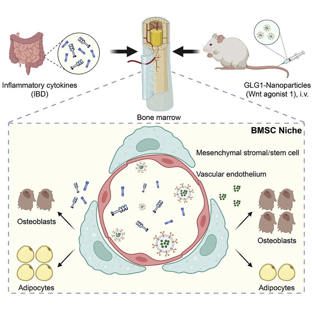利用本团队之前开发的杂化外泌体载药技术,研究人员基于受体-配体结合理论,借鉴前列腺癌骨转移分子机制,将GLG1分子表达于外泌体表面,生产并收集工具细胞系来源的GLG1+外泌体,构建搭载Wnt通路激活剂Wntagonist 1的GLG1+载药纳米颗粒(GLG1-NP)。结果发现,GLG1-NP外周给药能够实现纳米颗粒骨组织内特异性分布,经治疗的UC小鼠骨量、骨力学性能下降显著减轻,BMSC成骨分化、骨形成受抑显著改善。同时,GLG1-NP还能促进UC小鼠的骨折愈合,减少骨髓脂肪积累,在UC骨并发症中取得显著疗效。