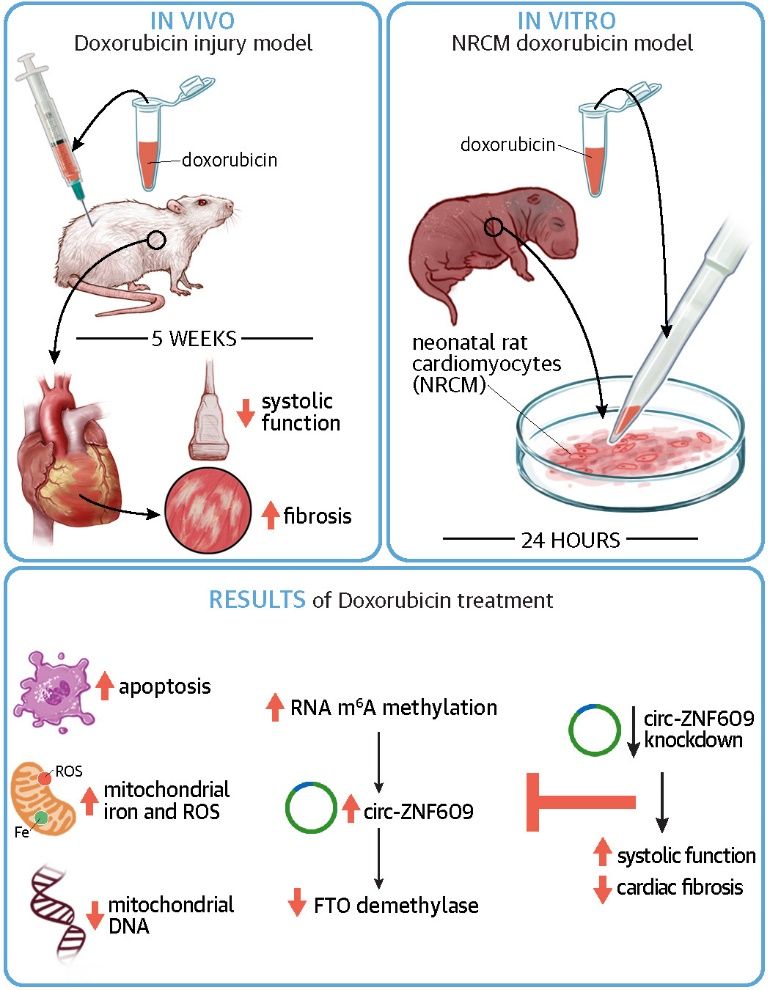 蒽环类药物阿霉素作为化疗药物广泛应用于多种实体肿瘤及血液系统肿瘤的一线治疗方案。心脏毒性是阿霉素临床应用的主要不良反应,随着化疗次数增加而造成的剂量累积,阿霉素可造成不可逆心脏毒性损伤。因阿霉素毒性损伤而产生的心力衰竭目前在临床上仍没有有效的治疗方案,极大地影响着患者的生活质量和远期预后。探索安全有效的阿霉素心肌毒性损伤防治方案具有重要的临床、社会和经济意义。环状RNA是一种新发现的内源性RNA。环状RNA广泛分布于人体组织中,在癌症、神经系统疾病和心血管疾病等多种疾病和病理生理过程中起着重要的调节作用。团队前期研究发现,抑制心脏中circ-ZNF609对心肌缺血再灌注损伤具有保护作用(Research, 2022, 2022: 9825916),但circ-ZNF609在抗肿瘤治疗引起的心脏毒性损伤中的作用尚不清楚。该研究发现,circ-ZNF609在阿霉素诱导的心脏毒性损伤模型中上调表达。研究明确了circ-ZNF609通过RNA m6A去甲基化酶FTO的调控阿霉素诱导心脏毒性损伤的分子机制:抑制circ-ZNF609可阻断阿霉素处理对小鼠心脏RNA m6A甲基化水平的升高,改善阿霉素诱导的心肌细胞凋亡以及降低线粒体内活性氧水平;同时,circ-ZNF609的表达也受到RNA m6A甲基化调控,RNA m6A甲基转移酶METTL14正向调控circ-ZNF609表达。