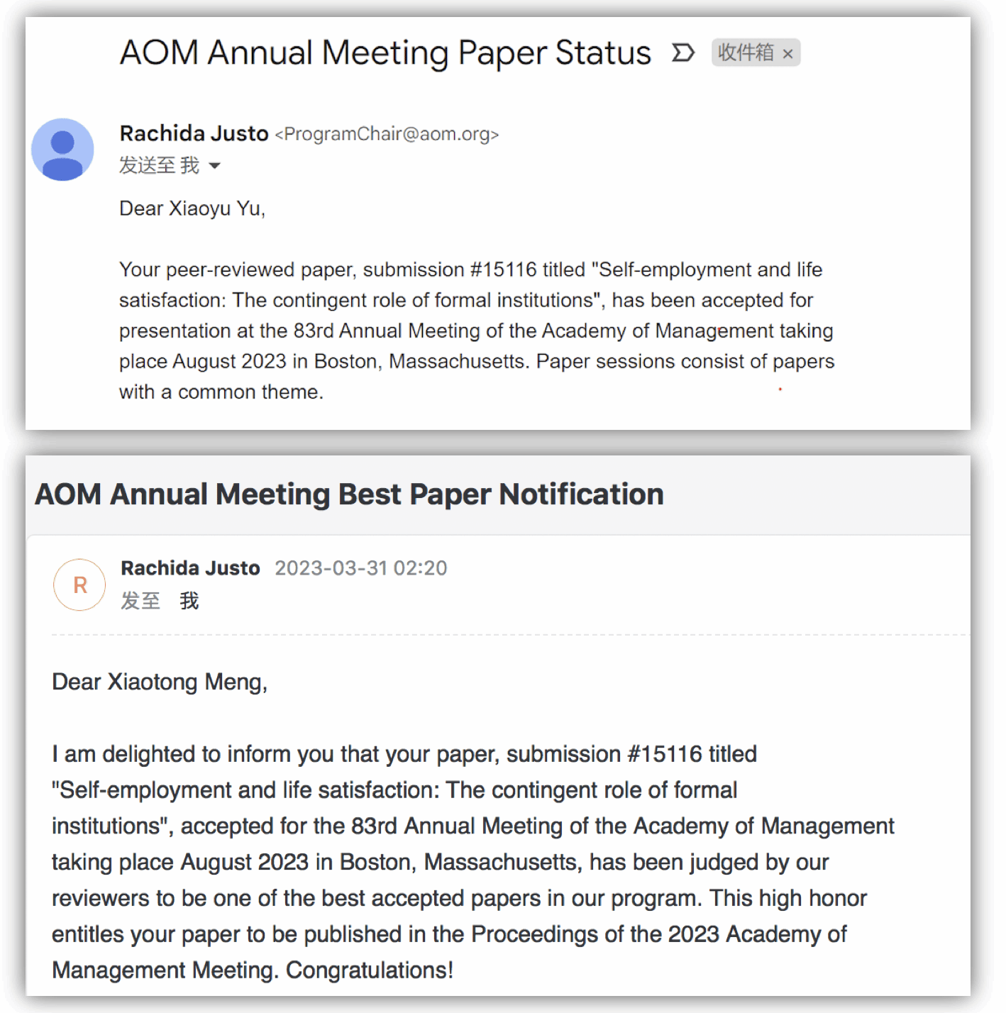 3月31日,sunbet申搏官方网站管理学院教授于晓宇、博士后孟晓彤、北卡罗来纳大学夏洛特分校教授Franz W. Kellermanns、Laura Stanley合作论文荣获2023年美国管理学会(Academy of Management, AoM)创业分部最佳会议论文奖。获奖论文是“Self-employment and life satisfaction: Thecontingent role of formal institutions(自雇与生活满意度:正式制度的调节作用)”。