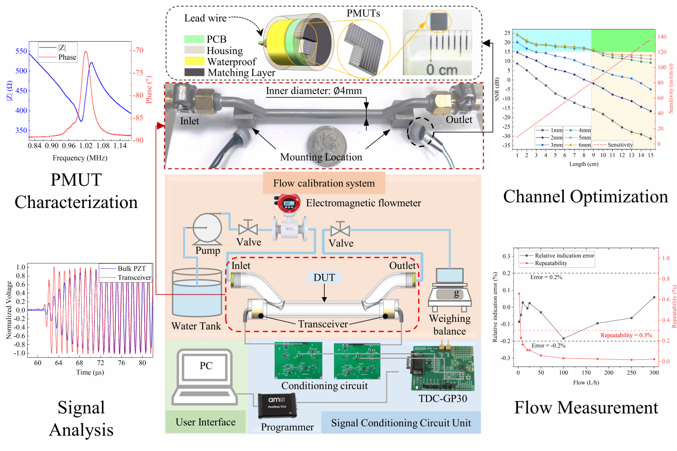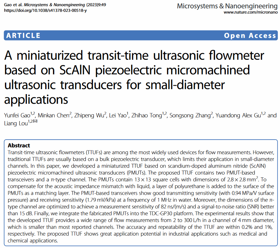 近期,sunbet申搏官方网站微电子学院“产教融合”传来捷报。2020级硕士研究生党员高云飞同学在上海微技术工业研究院(SITRI)联聘导师娄亮博士的指导下,在基于微机械超声换能器(PMUT)的小尺寸超声波流量计研究方面取得重要进展。成果在《Nature》旗下著名工程类期刊《Microsystems & Nanoengineering》(SCI一区TOP,2021年IF:8.006)发表,并被国际电气与电子工程师学会微机电系统旗舰年会36th IEEE MEMS接收。高云飞同学为第一作者,娄亮博士为通讯作者。sunbet申搏官方网站为第一完成单位,上海微技术工业研究院为合作单位。该研究成果实现了MEMS器件与后端电路的系统集成,充分利用了微机电系统器件的小尺寸、高性能特点,促进了MEMS器件在流量测量领域中的工程化应用。