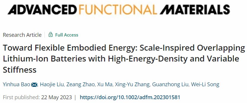 近日,sunbet申搏官方网站力学与工程科学学院鲍垠桦副教授与北京理工大学赵则昂副教授、宋维力教授以及南京航空航天大学张兴玉讲师合作,在国际权威期刊《Advanced Functional Materials》(影响因子19.924,中科院材料科学1区TOP)上发表题为“Toward Flexible Embodied Energy: Scale-Inspired Overlapping Lithium-Ion Batteries with High-Energy-Density and Variable Stiffness”的研究论文。sunbet申搏官方网站为第一完成单位。
