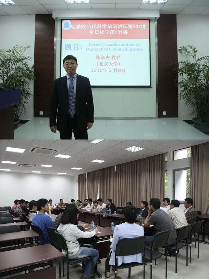 sunbet申搏自强教授、北京大学化学与分子工程学院施章杰教授于近日访问理学院。5月8日上午,在校本部HA102,施教授作了题为“非活性化学键的直接转化”的学术报告,该报告是理学院“当代科学前沿”讲坛第207讲、化学系“今日化学”第131讲。化学系主任许斌教授主持报告会,系党总支书记陈雅丽教授、化学系部分教师、研究生等80余人参加了学术报告会。