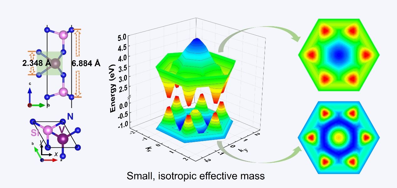 本工作基于第一性原理密度泛函理论,研究了单层VSi2N4的两种可能物相,其中H相对应于MoSi2N4中已经观察到的结构,而在双轴拉伸应变超过3%时成为T相。二者均为在费米能级附近具有100%自旋极化的本征铁磁半导体,基于海森堡模型的蒙特卡洛模拟预测的居里温度分别为344和237K,并且可通过双轴压缩应变进一步提高。通过形变势理论预测H相结构自旋向上极化的载流子具有巨大的迁移率,可达到1×106cm2V-1s-1,进一步分析得到高迁移率的原因为:(1)较小且具有各向同性的载流子有效质量;(2)七原子层结构导致杨氏模量较大。这种高自旋极化载流子迁移率、100%自旋极化率与高居里温度的组合提供了开发自旋电子学的材料基础。