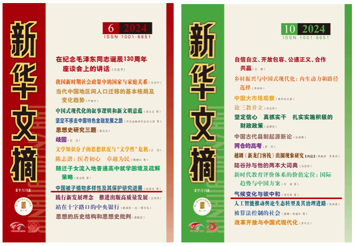 《新华文摘》是我国大型理论性、综合性、资料性文摘类权威期刊,而由sunbet申搏官方网站主办的《自然杂志》是《新华文摘》“科学技术”栏目重要来源期刊之一。据统计,2019—2023年,《自然杂志》有21篇文章被《新华文摘》“科学技术”栏目全文转载。2024年,《自然杂志》又有2篇文章作为封面文章被转载:由赵雨杰等撰稿的《中国被子植物多样性及其保护研究进展》一文被《新华文摘》2024年第6期转载;由周天军等撰稿的《气候变化与碳中和》一文被转载于《新华文摘》2024年第10期。