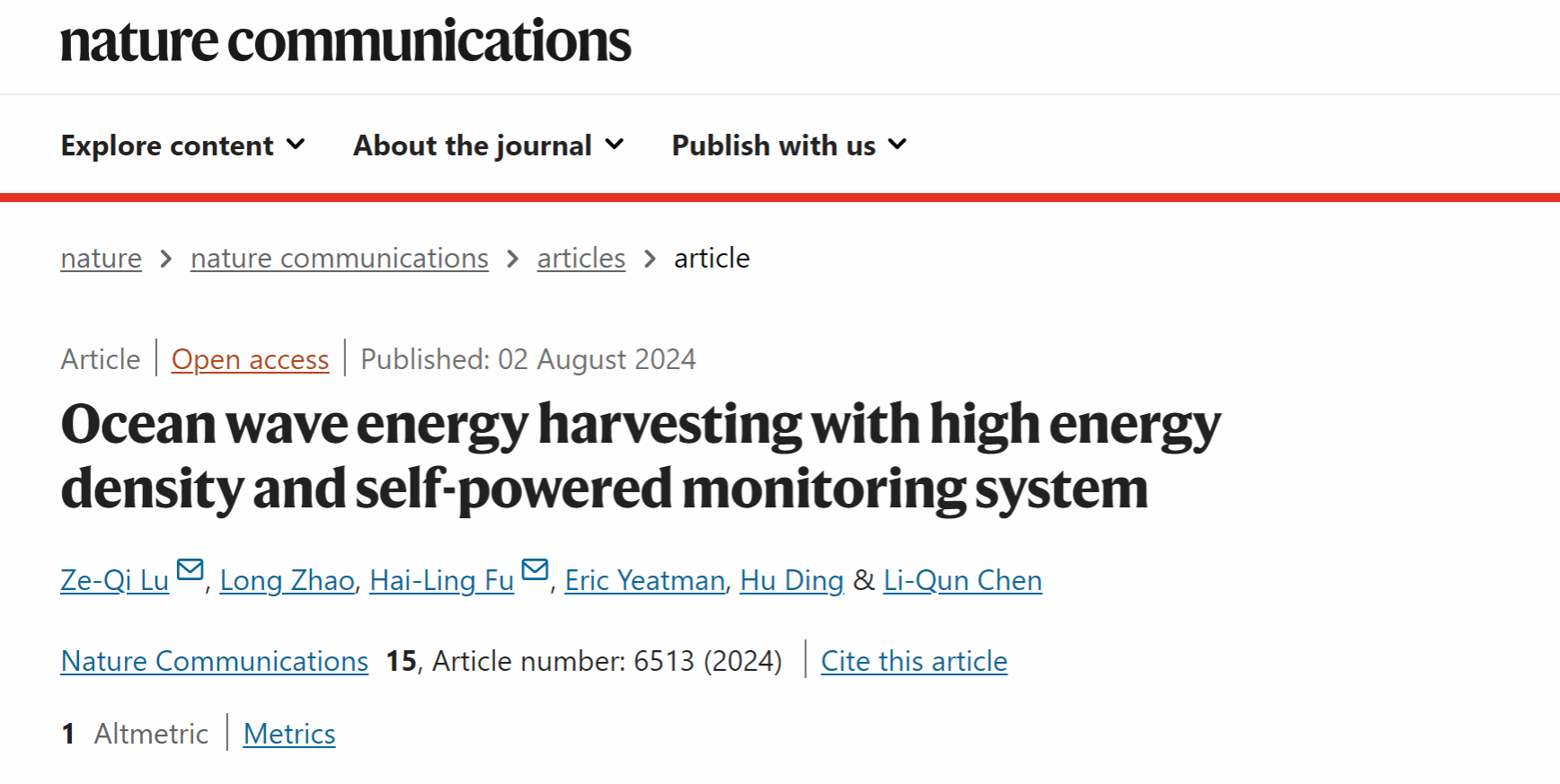 2024年8月2日,sunbet申搏官方网站力学与工程科学学院陆泽琦副研究员与合作单位团队在国际著名期刊《Nature Communications》(IF=16.6)上发表题为“Ocean wave energy harvesting with high energy density and self-powered monitoring system”的研究成果。sunbet申搏官方网站为第一单位,sunbet申搏官方网站力学与工程科学学院陆泽琦副研究员为第一作者及共同通讯作者,北京理工大学付海岭教授为共同通讯作者,论文合作作者还包括sunbet申搏官方网站力学与工程科学学院陈立群教授、丁虎研究员、赵龙博士生,英国皇家科学院院士及其银质奖章获得者、英国帝国理工大学Eric Yeatman教授。