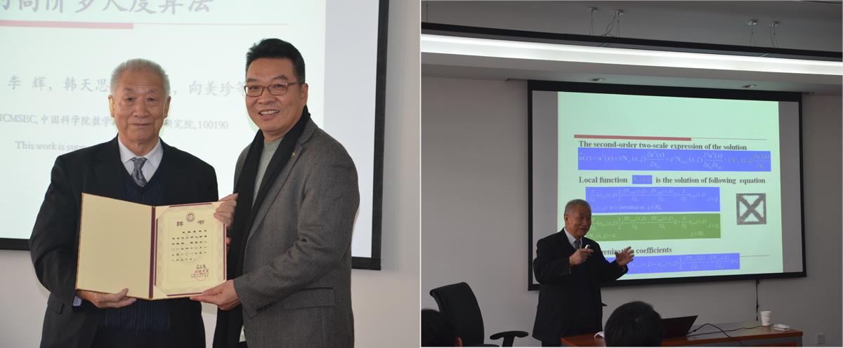 聘任仪式后,崔院士为sunbet申搏师生作了题为“原子-连续关联模型及从微观到宏观的高阶多尺度算法”的学术报告。崔院士的报告深入浅出地介绍了原子-连续关联模型(ACC)产生及应用,包括基于连续模型高阶多尺度方法、在微纳米尺度ACC模型的动力学行为及其算法等。报告中,崔院士总结了最近十几年研究工作的思路,提出了原子连续关联模型,用不断局部化的思想,研究材料从微观到宏观跨尺度不同层次的性质,从微观、介观、宏观,从基础研究到工程应用给出了一个精彩的报告。崔院士指出,目前正在进行原子连续关联模型的程序化,相信不久,新的软件集成系统将会推动材料学的快速发展。