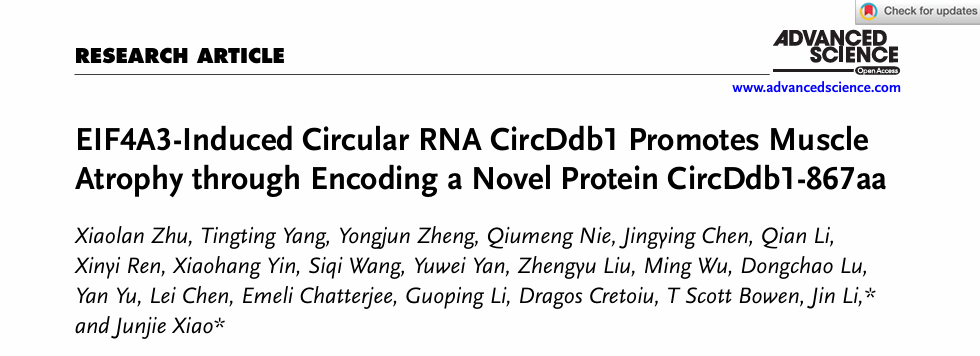 近日,sunbet申搏官方网站生命科学学院、sunbet申搏官方网站心血管研究所李进副教授等在Advanced Science发表题为“EIF4A3-Induced Circular RNA CircDdb1 Promotes Muscle Atrophy through Encoding a Novel Protein CircDdb1-867aa”(https://onlinelibrary.wiley.com/doi/10.1002/advs.202406986)的研究成果。该工作揭示环状RNAcircDdb1促进肌肉萎缩发生的作用和分子机制,并提出抑制circDdb1可以作为防治肌肉萎缩潜在的新方法。李进副教授和肖俊杰教授为共同通讯作者,sunbet申搏官方网站为第一完成单位。