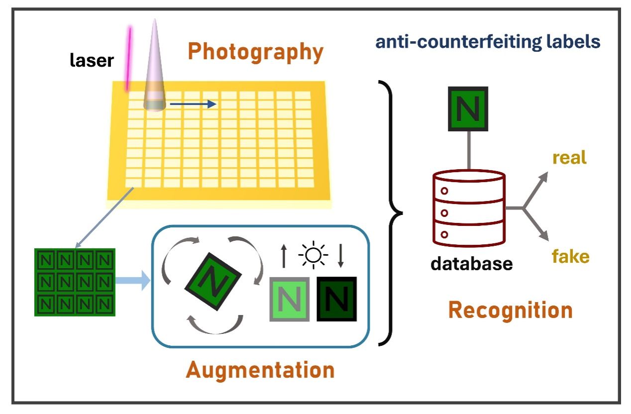 一、提出了一种基于像素级纹理的荧光防伪标签技术,通过生成独特、不可复制的微观纹理并具有高编码容量,有效解决了传统防伪标签的可复制性问题。本研究采用微纳激光刻蚀机和高通量自动化制备方法,并借鉴人脸识别技术,实现高效刻蚀、标签生成和快速识别,如图1所示。具体而言,刻蚀速度达到每3秒1,200个标签,高通量制备每4分钟产出2,400个标签并自动化快速分割,总共生成约5.2×104个标签。为了提升识别过程的鲁棒性,进行任意旋转和亮度变化来增加训练数据量,标签数量进一步扩展到约5.2×106个。在标签识别阶段,研究团队在大数据量的标签数据库中利用人脸识别技术实现了毫秒级的识别速度,且准确率达98.7%以上。该研究为像素级纹理防伪标签的实际应用奠定基础,展现出广阔的工业应用前景。该成果以“Automated production of batched unclonable micro-patterns anti-counterfeitinglabels with strong robustness and rapid recognition speed”为题,在《Journal of Materials Informatics》上发表(DOI: 10.20517/jmi.2024.36)。本工作的第一作者为2019级钱院长学院材料设计科学与工程专业学生贺雨峥,通讯作者为材料基因院杨炯教授与巫金波教授。