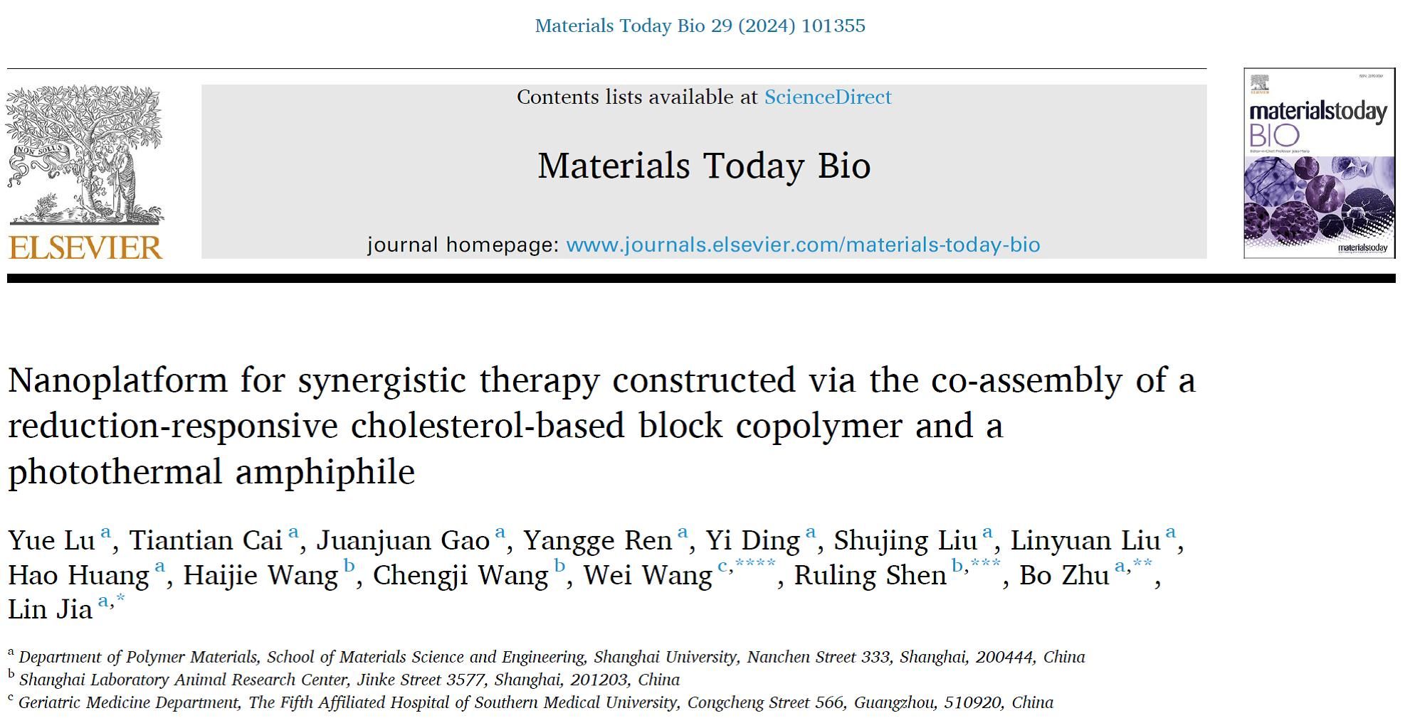近日,材料学院贾林课题组、朱波课题组在共混组装制备光热-还原双响应共胶束用于光热-化疗协同治疗领域取得研究进展,相关成果以“Nanoplatform for synergistic therapy constructed via the co-assembly of a reduction-responsive cholesterol-based block copolymer and a photothermal amphiphile”为题发表在《Materials Today Bio》(中科院一区,影响因子8.7)。高分子材料系博士生卢悦为论文第一作者。