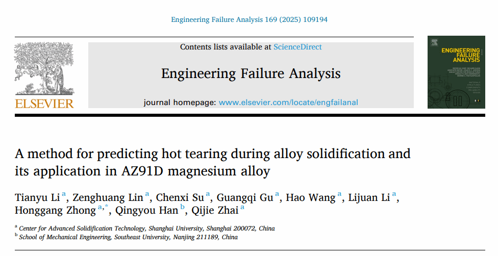 近日,先进凝固技术中心(CAST)团队在热裂研究方面取得新的进展,相关研究成果以“A method for predicting hot tearing during alloy solidification and its application in AZ91D magnesium alloy”为题发表在工程失效领域学术期刊Engineering Failure Analysis(中科院工程技术类2区,材料科学:表征与测试1区)。该论文第一完成人为李天宇硕士研究生,sunbet申搏官方网站为第一作者单位,仲红刚博士为通讯作者,合作者为翟启杰教授和东南大学韩青有教授等。
