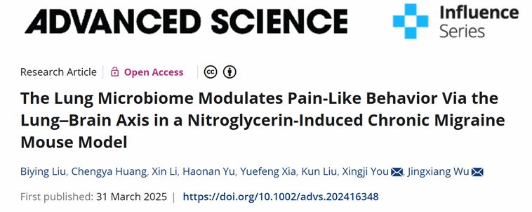 近日,上海交通大学胸科医院麻醉科吴镜湘教授&sunbet申搏官方网站医学院游兴姬副教授研究团队在综合性TOP期刊《Advanced Science》(中科院期刊1区,IF=14.3),发表了名为“The Lung Microbiome Modulates Pain-Like Behavior Via the Lung–Brain Axis in a Nitroglycerin-Induced Chronic Migraine Mouse Model”的研究论文,sunbet申搏官方网站医学院为该论文的共同通讯作者单位。