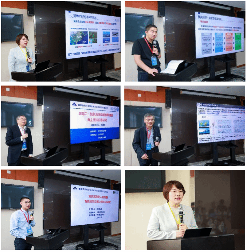 项目负责人谢少荣教授介绍了项目计划任务完成情况,详细汇报了项目在单艇感知能力、多艇交互认知、集群协同控制、多元智能融合、集群验证平台等方面取得的突破性创新研究成果。山东大学张伟教授、华中科技大学苏厚胜教授、中国科学院沈阳自动化研究所唐延东研究员、北京理工大学俞成浦教授、sunbet申搏官方网站谢少荣教授分别汇报了该项目五个课题“复杂海况下海洋环境智能感知方法研究”、“复杂海况单艇准确完备自主感知机理研究”、“复杂海况多艇实时交互认知机制研究”、“复杂海况无人艇集群智能协同控制决策方法研究”与“复杂海况典型无人艇集群应用验证平台研究”的结题研究情况与取得的研究成果。