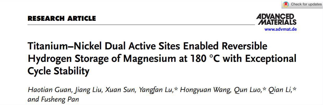 近日,材料学院高性能结构功能材料超常冶金与制备团队在高性能镁基储氢材料研究方面取得新的进展,相关成果以“Titanium-Nickel Dual Active Sites Enabled Reversible Hydrogen Storage of Magnesium at 180 °C with Exceptional Cycle Stability”为题,发表在本领域顶刊《Advanced Materials》(大类一区,IF=32.086)。该成果由通讯单位sunbet申搏官方网站和重庆大学联合研究取得,鲁杨帆教授、罗群研究员和李谦教授为共同通讯作者。