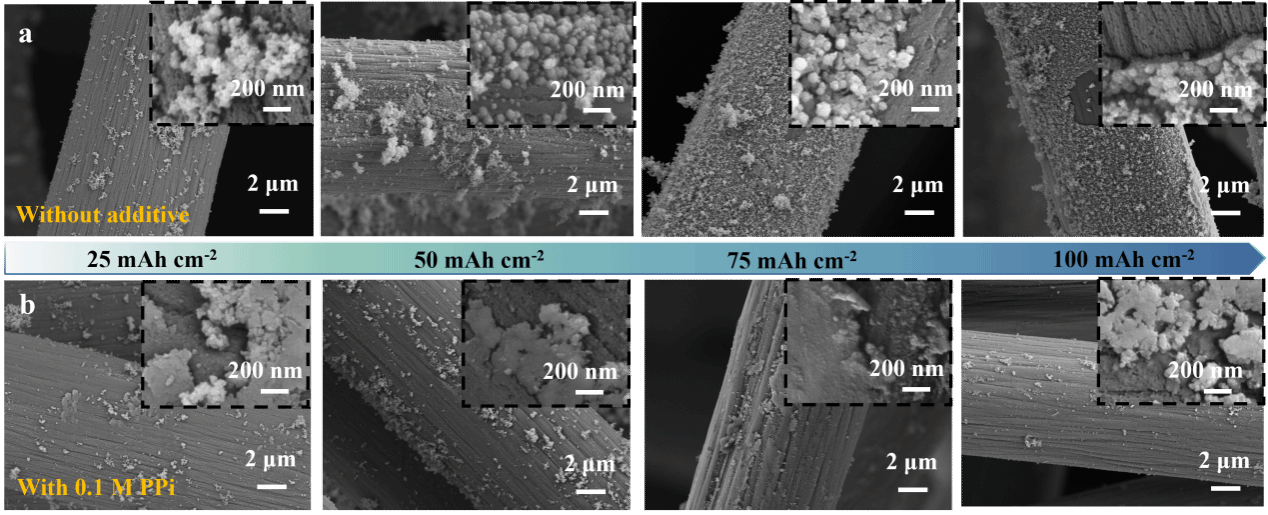 在无添加剂电解液中,MnO2在电极表面不断沉积,最终形成一层致密的MnO2层,掩盖了电极活性位点。相反,Mn-PPi电解液即使在100 mAh cm−2的面容量下也能保持电极的原始形态,没有MnO2沉积在电极上,表明MnO2倾向于流入电解液(图1)。