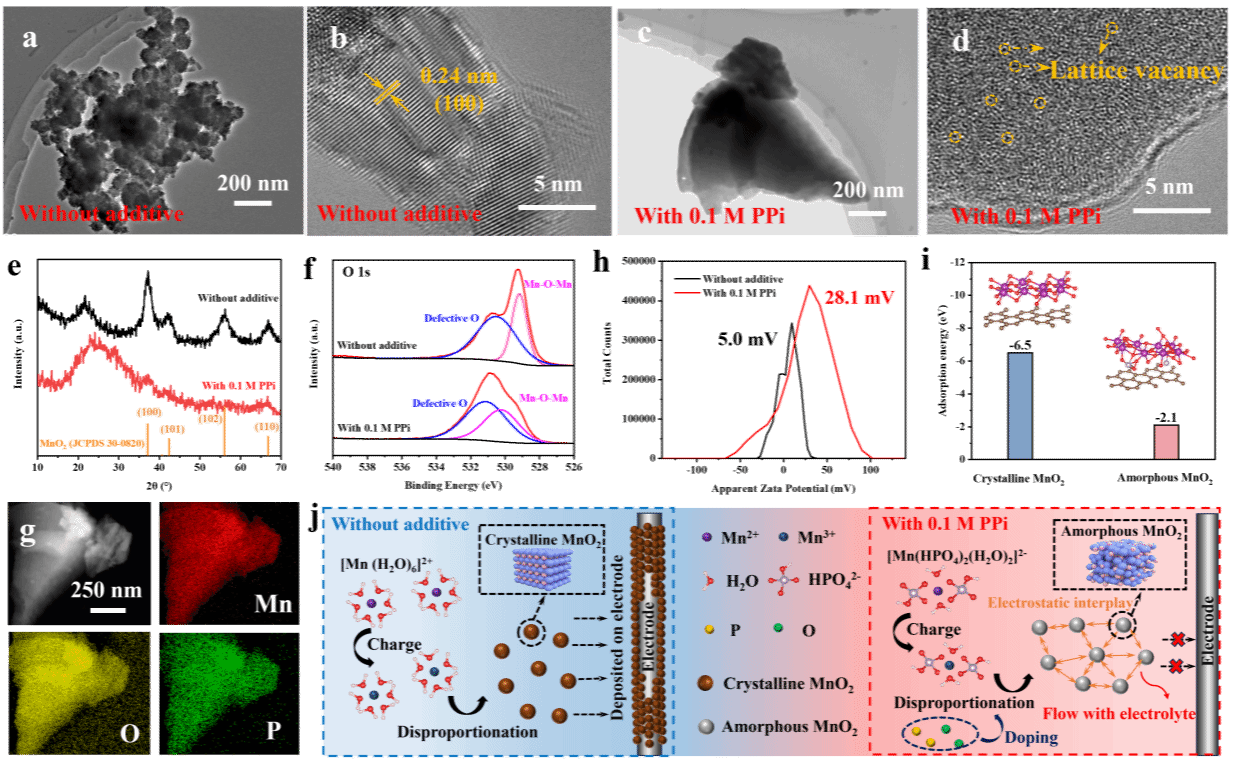 无添加剂电解液中,[Mn(H2O)6]2+主导的溶剂化结构促进了MnO2向明确的晶体晶格生长,导致晶体MnO2在电极上的逐步沉积,进而钝化电极的电活性位点。相比之下,加入PPi后,氢键网络被重新配置为[Mn(HPO4)2(H2O)2]2-配位复合物,可能使磷酸基团整合到正在形成的MnO2结构中,导致结晶过程中出现氧缺陷和磷掺杂。PPi添加剂的作用可能提供一个软模板,通过引入空位缺陷破坏MnO2的晶体结构,从而促使MnO2从晶体结构转变为非晶态。非晶态MnO2通过静电相互作用机制在电解液中保持动态分散,保持连续再生的电极电活性界面(图2)。