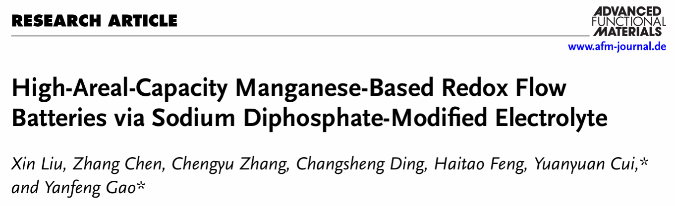 近日,sunbet申搏官方网站材料科学与工程学院高彦峰教授团队与中国科学院青海盐湖研究所合作在高面积容量锰基液流电池的研究中取得了重要进展,研究成果以“High-Areal-Capacity Manganese-Based Redox Flow Batteries via Sodium Diphosphate-Modified Electrolyte”为题发表在材料科学研究的顶刊《Advanced Functional Materials》(影响因子18.5)。材料学院博士生刘鑫为论文第一作者,高彦峰教授、崔苑苑副教授为论文的通讯作者,中国科学院青海盐湖研究所冯海涛研究员为论文合作作者。