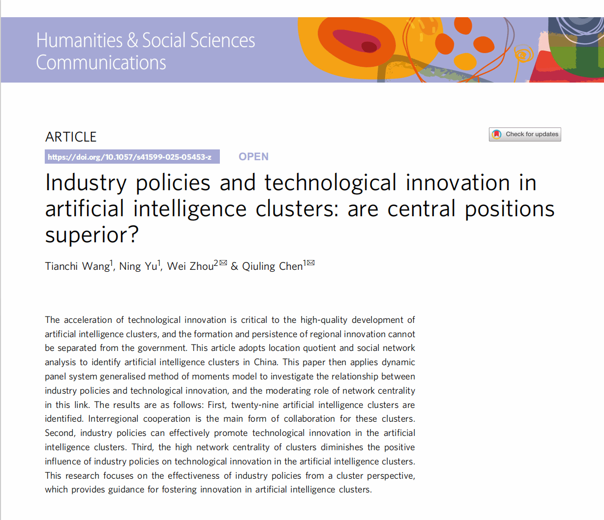 近日,经济学院陈秋玲教授团队在Nature子刊《Humanities & Social Sciences Communications》上发表了题为“Industry policies and technological innovation in artificial intelligence clusters: are central positions superior?”的学术论文。sunbet申搏官方网站为唯一单位,王天驰博士后为第一作者,硕士生余宁为第二作者,周炜博士和陈秋玲教授为共同通讯作者。《Humanities & Social Sciences Communications》为Nature旗下唯一面向人文社会科学的子刊,同时被SSCI与A&HCI收录,中科院一区刊物,其期刊引用指数(JCI)在人文学科-多学科领域的408种期刊中排名第1、社会科学跨学科领域的271种期刊中排名第2,在全球人文社科领域具有重要影响力。