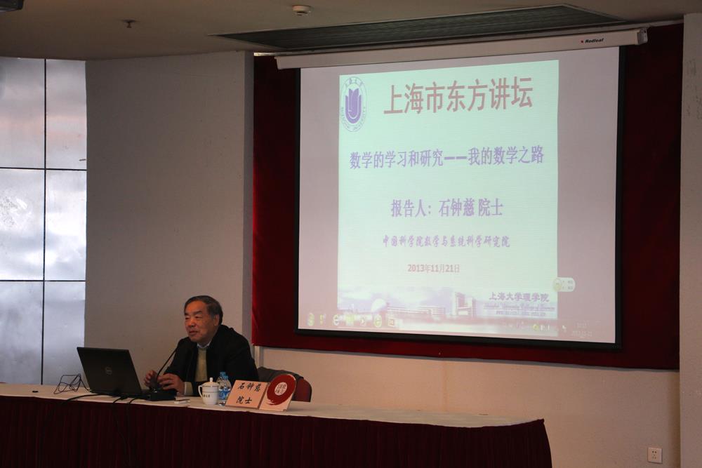 上海市东方讲坛: “数学的学习和研究—我的数学之路”于2013年11月21日上午在sunbet申搏官方网站校本部行政楼报告厅隆重举行。sunbet申搏官方网站迎来了中国科学院院士石钟慈先生,师生们济济一堂,还有校外的许多听众慕名前来,一起参加了这次“上海市东方讲坛”报告会。